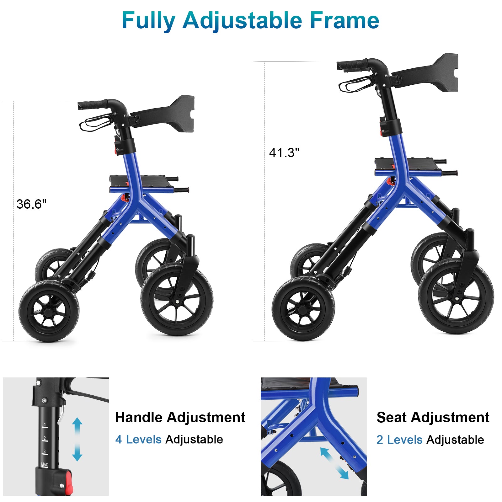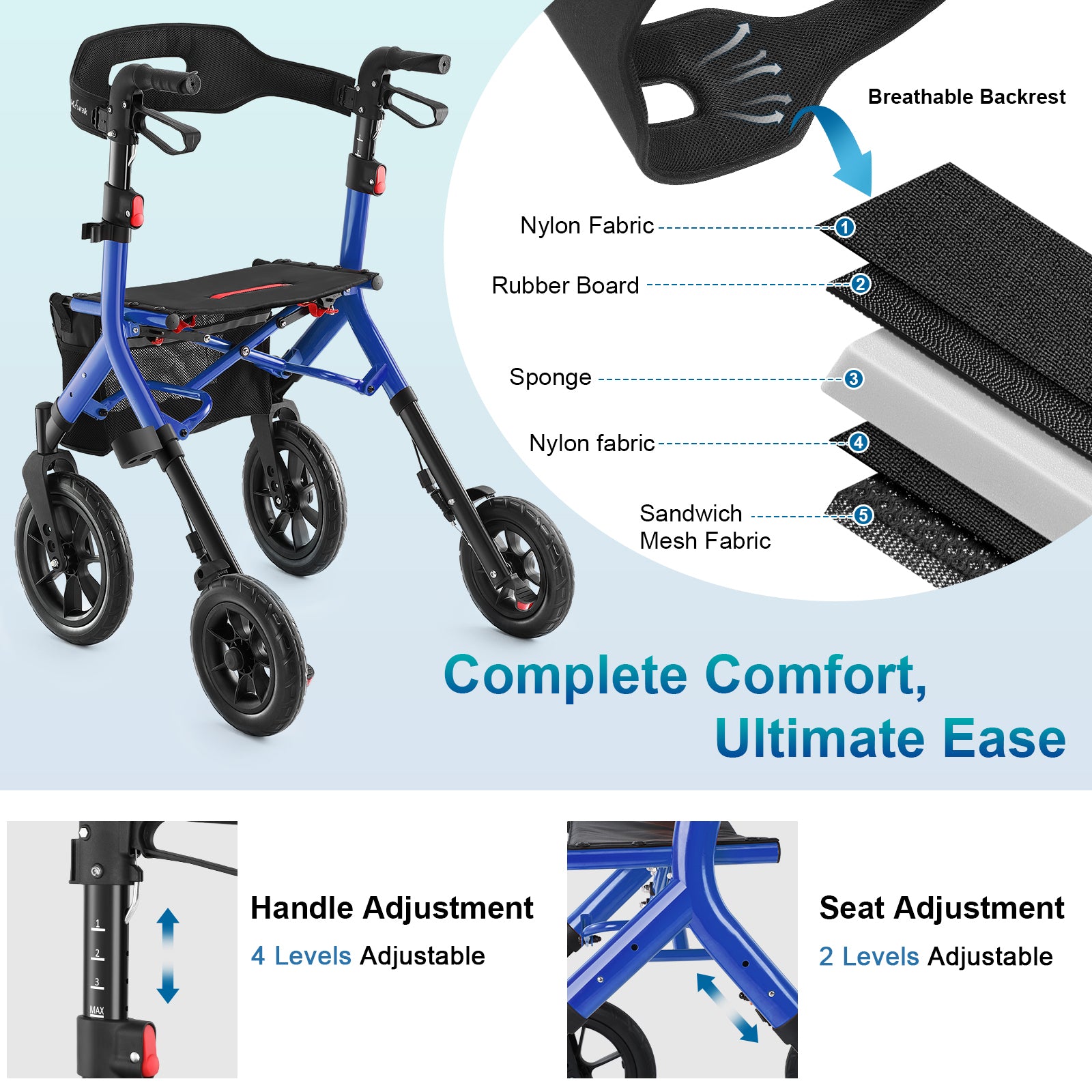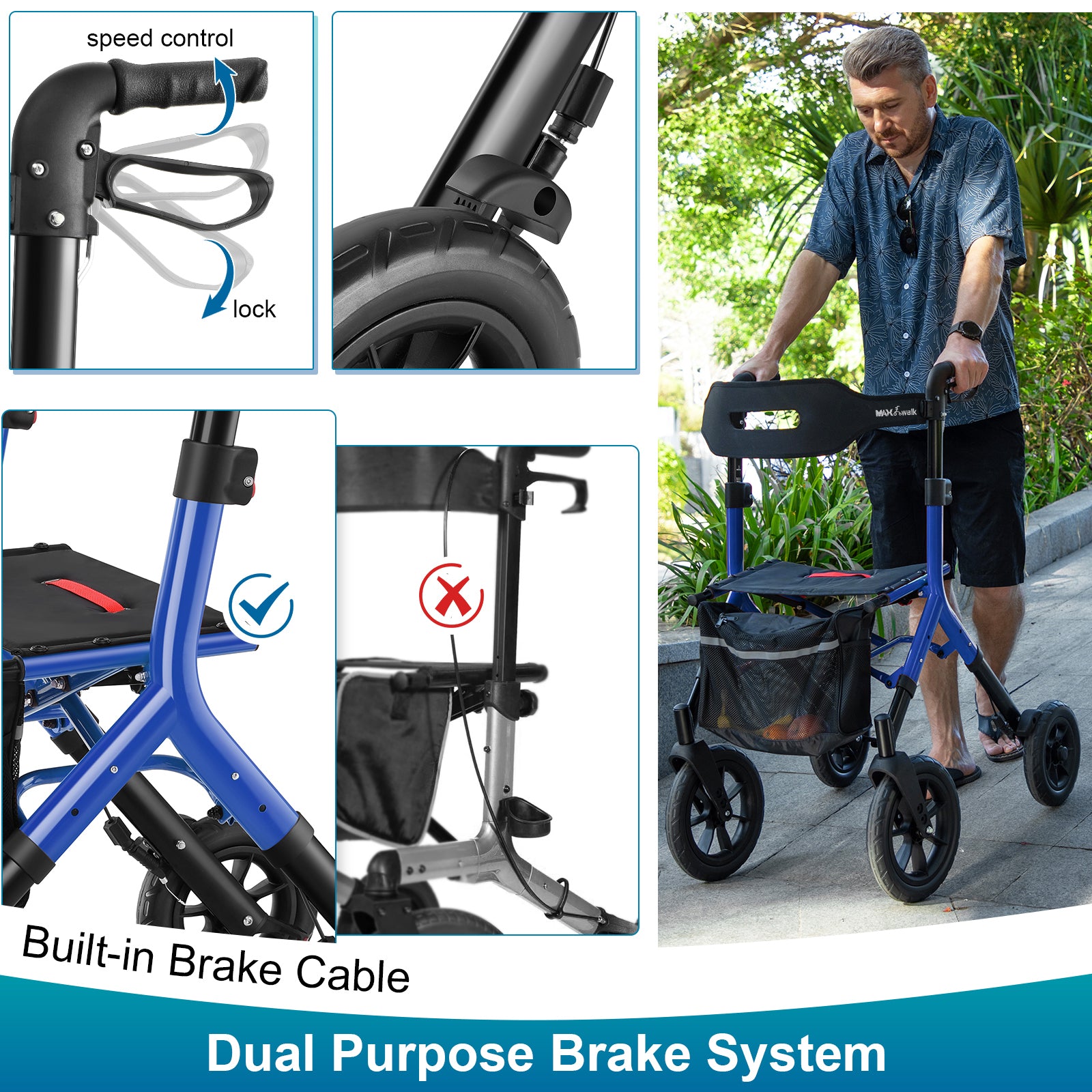 MAXWALK Rollator Walker with Seat, Tall Walkers for Seniors, 12" Big Rubber Wheels All Terrain Rollator Walker with Backrest, Built-in Cable, Foldable and Dual Adjustable Height for 5.3-7ft, Blue