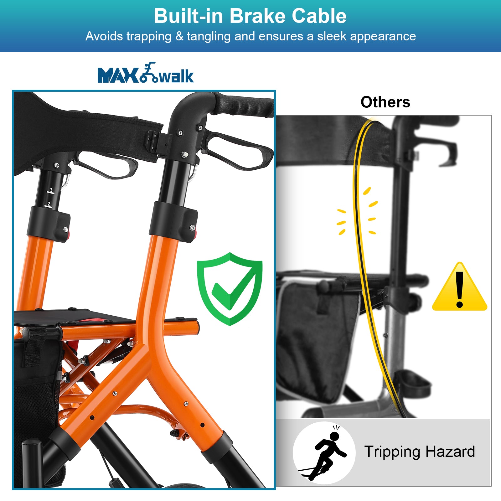 - 【Upgraded Safety-Built-in Cable Design】MAXWALK rolling walker adopts a built-in brake cable to avoid the risk of tangling and tripping while ensuring a compact appearance. The dual braking system supports speed control and lock, provides better control for braking and sitting.