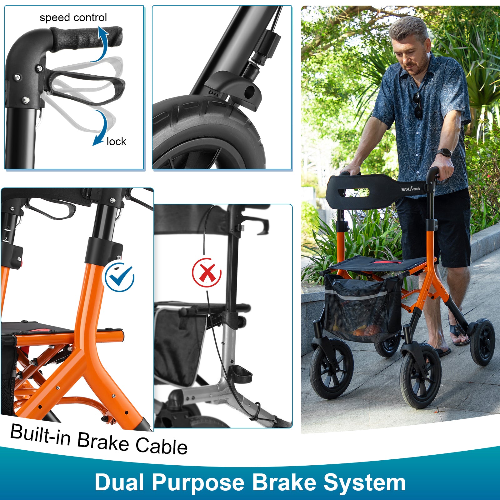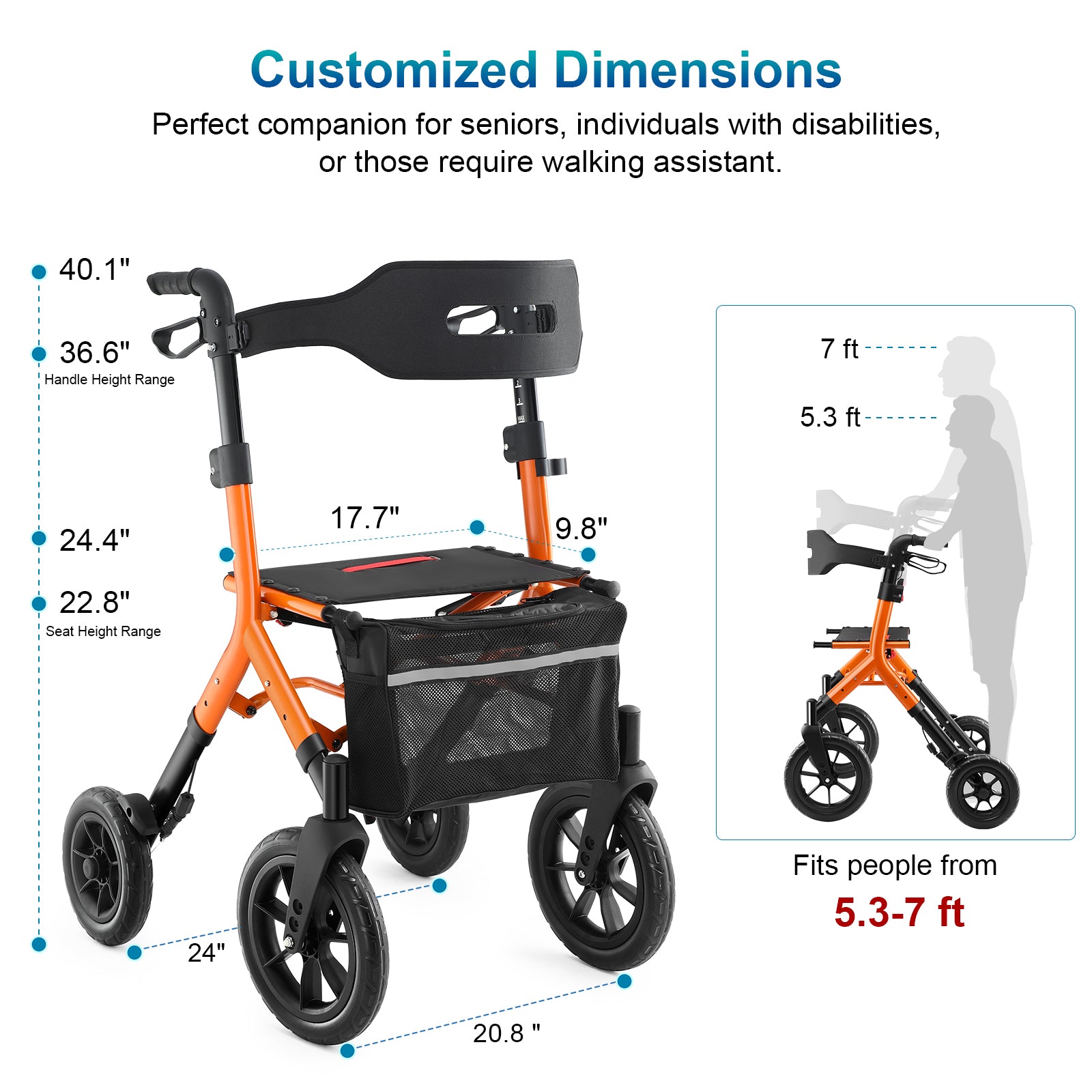 Rollator Walker with Seat, Tall Walkers for Seniors, 12" Big Rubber Wheels All Terrain Rollator Walker with Backrest, Built-in Cable, Foldable and Dual Adjustable Height for 5.3-7ft, Orange
