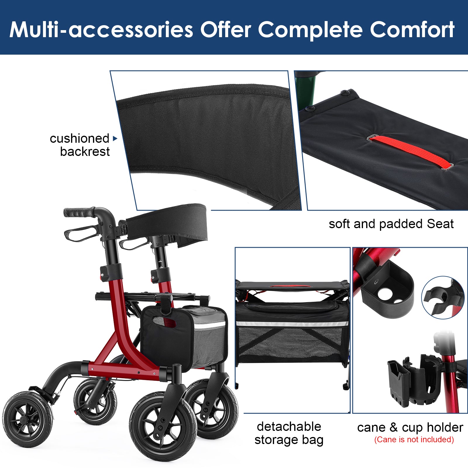 - 【Wider Seat &Backrest, Removable Cup Holder&Storage Pouch】Our rollator walker comes with essential accessories, ensuring a comfortable and safe rest with its padded seat and backrest. We also provide extra removable cup & cane holder & storage pouch for personal items to free your hands.