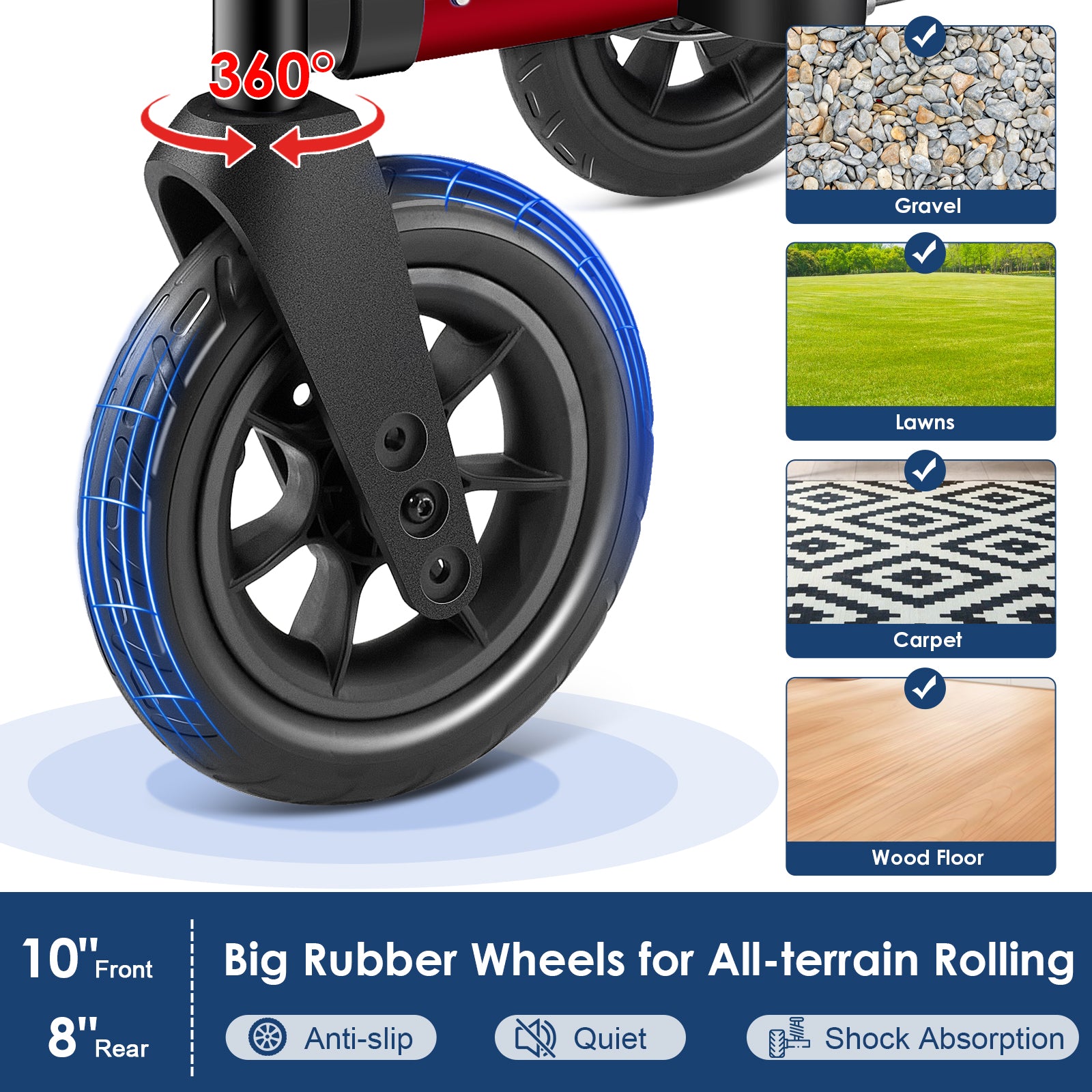 - 【All Terrain Walker】Our walkers for seniors are equipped with all terrain wheels and 10 inch front all-terrain tires provides a larger contact area, significantly boosting stability. it works well on gravel, lawns, carpet, wood floor and so on.