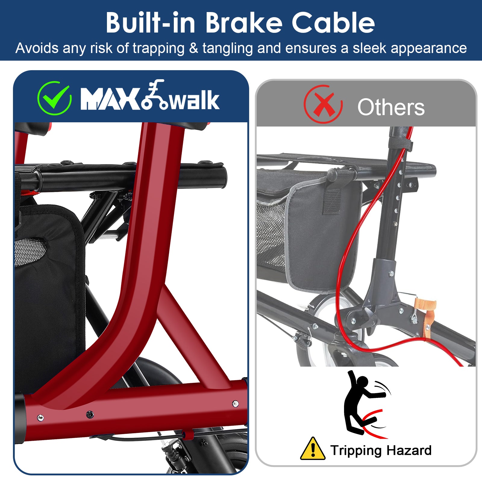 - 【Upgraded Safety-Built-in Cable Design】MAXWALK adopts a built-in brake cable to avoid the risk of tangling and tripping while ensuring a compact appearance. The dual braking system supports speed control and lock, provides better control for braking and sitting.