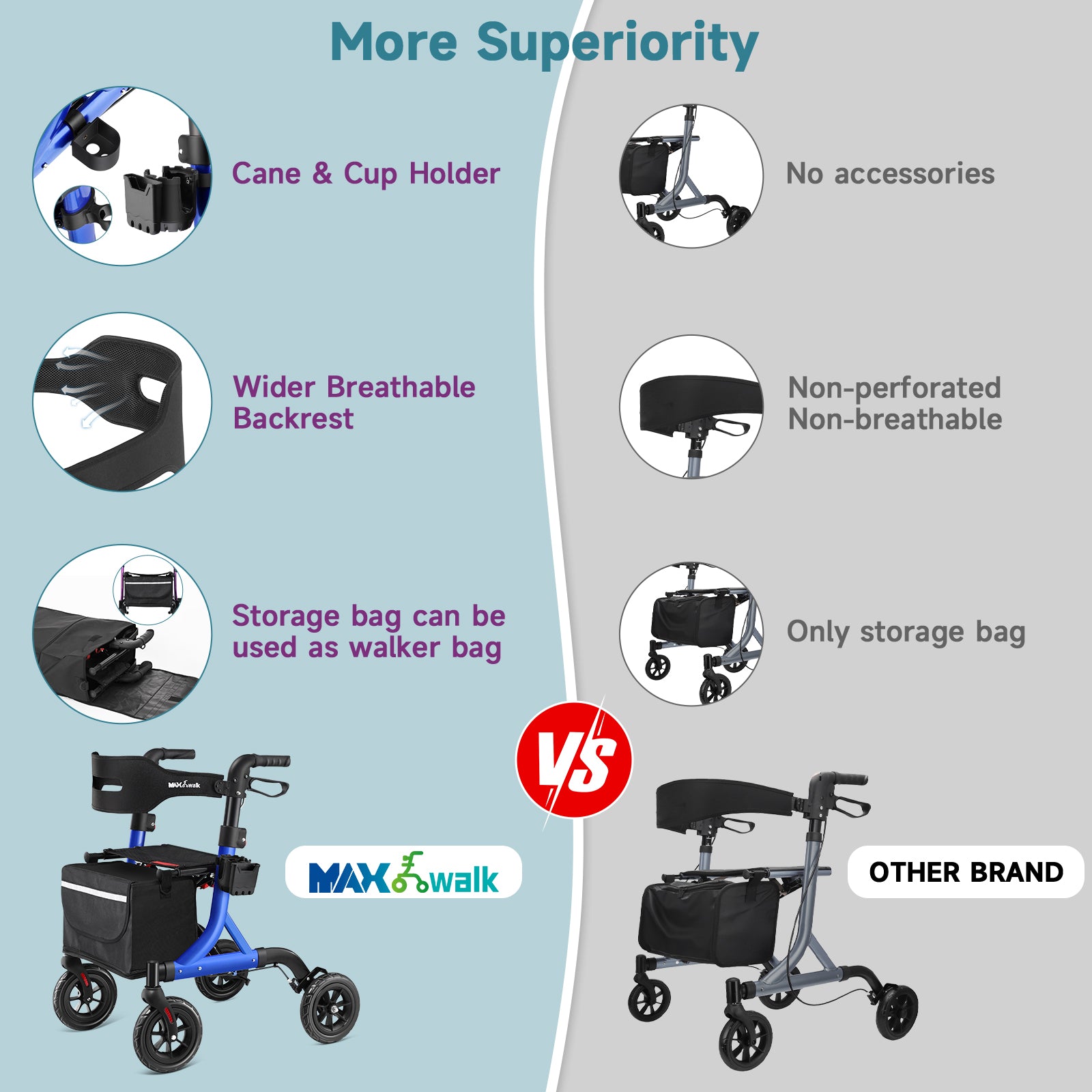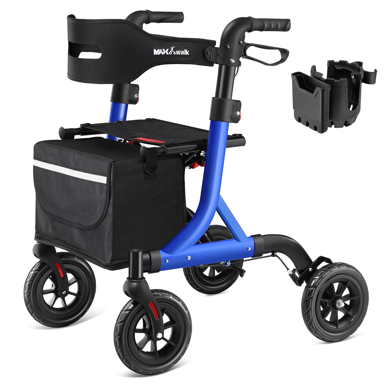 - 【8 Inch Rubber Wheels】MAXWALK rollator walker comes with large rubber wheels (8" front, 8" back),360° swivel for smooth rolling, non-slip, shock absorption for outdoor such as bumpy roads, gravel, concrete, grass, etc.